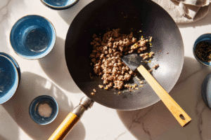 • Heat olive oil in a large skillet or wok over medium-high heat. Add ground beef and cook until browned, breaking it apart with a spatula.