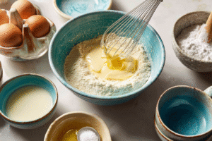 - Add egg, melted butter, almond milk, and vanilla extract. Mix until smooth and no lumps remain.