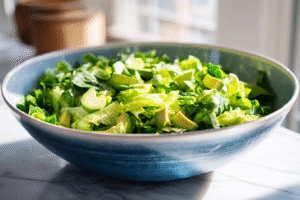 - In a large bowl, combine lettuce, spinach, and avocado slices.