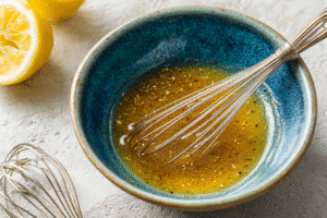 - Whisk together olive oil, lemon juice, and Dijon mustard for the dressing.