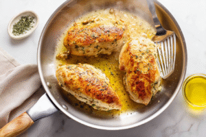 When cutting the pocket in each chicken breast, keep your knife parallel to the cutting board and stop about ½ inch from the edge. That helps keep the filling inside as it bakes. And if a little cheese melts out into the pan? That’s the best part — those crispy golden bits are pure flavor.