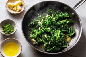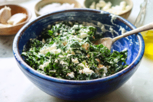 • In a skillet, heat 1 tablespoon of olive oil over medium heat. Add garlic and chopped kale; sauté for 2–3 minutes until wilted. Remove from heat and let cool slightly.