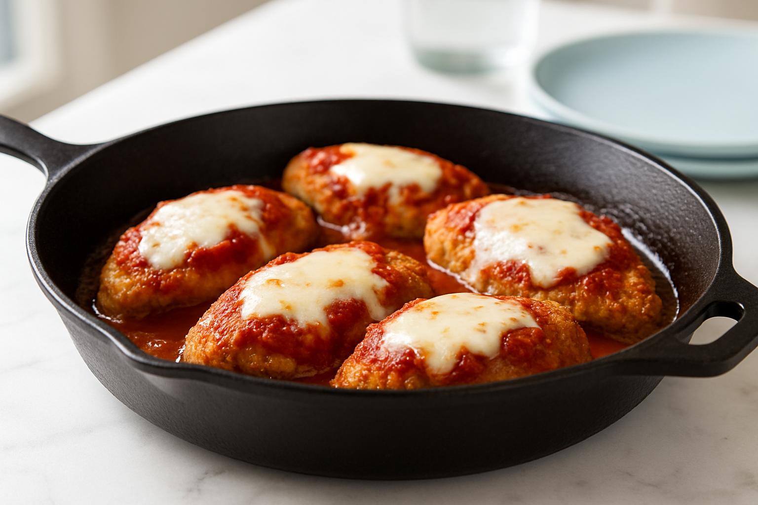 This keto chicken parm skillet often tastes better the next day thanks to the cheese melding. Store leftovers in an airtight container in the fridge for up to 3 days. Reheat in the oven at 350°F for 15 minutes to keep the crust crispy — microwave reheating may make it soggy. For fresh finishes, prep and sear chicken ahead, then add sauce and cheese just before serving.