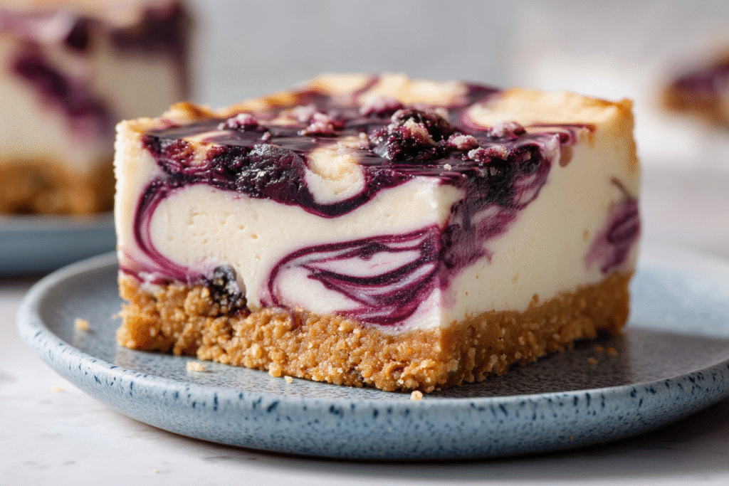 If you’re someone who likes desserts that feel creamy without being too heavy, this is made for you. The filling gets incredibly smooth, but the whipped cream keeps it airy and soft. The crust holds together nicely, giving each bite a gentle crunch. And the blueberry swirl? That’s the part that makes every slice look and taste like you put in way more effort than you did. These bars are also great for sharing, especially when you want something that looks pretty on a platter but doesn’t take a lot of work behind the scenes. Once you taste that first chilled bite, I think you’ll see why this dessert becomes an easy favorite.