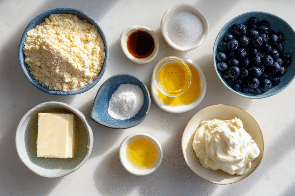 The almond flour crust gives you that classic crumble base without needing to bake it. It firms up beautifully once chilled. The cream cheese filling is sweet, smooth, and uses whipped cream to keep it fluffy instead of dense. Powdered erythritol blends in without graininess, and vanilla adds that soft, familiar warmth. The blueberry swirl might be the simplest part, but it brings the whole dessert together — a little tartness, a little sweetness, and a beautiful pop of color. Every ingredient has a purpose, and they come together in a way that feels balanced and satisfying.