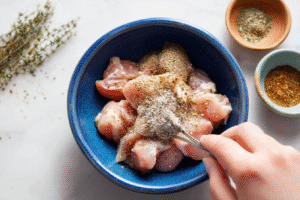 - Season chicken pieces with salt, pepper, and Italian seasoning.