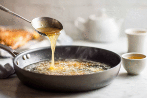 - Pour in chicken broth and simmer for 2 minutes, scraping any browned bits from the pan.