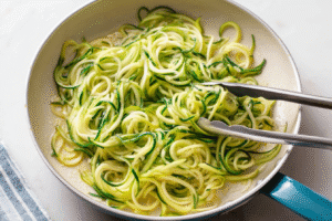 - Add zucchini noodles to the skillet and toss gently for 2–3 minutes until just tender (do not overcook).